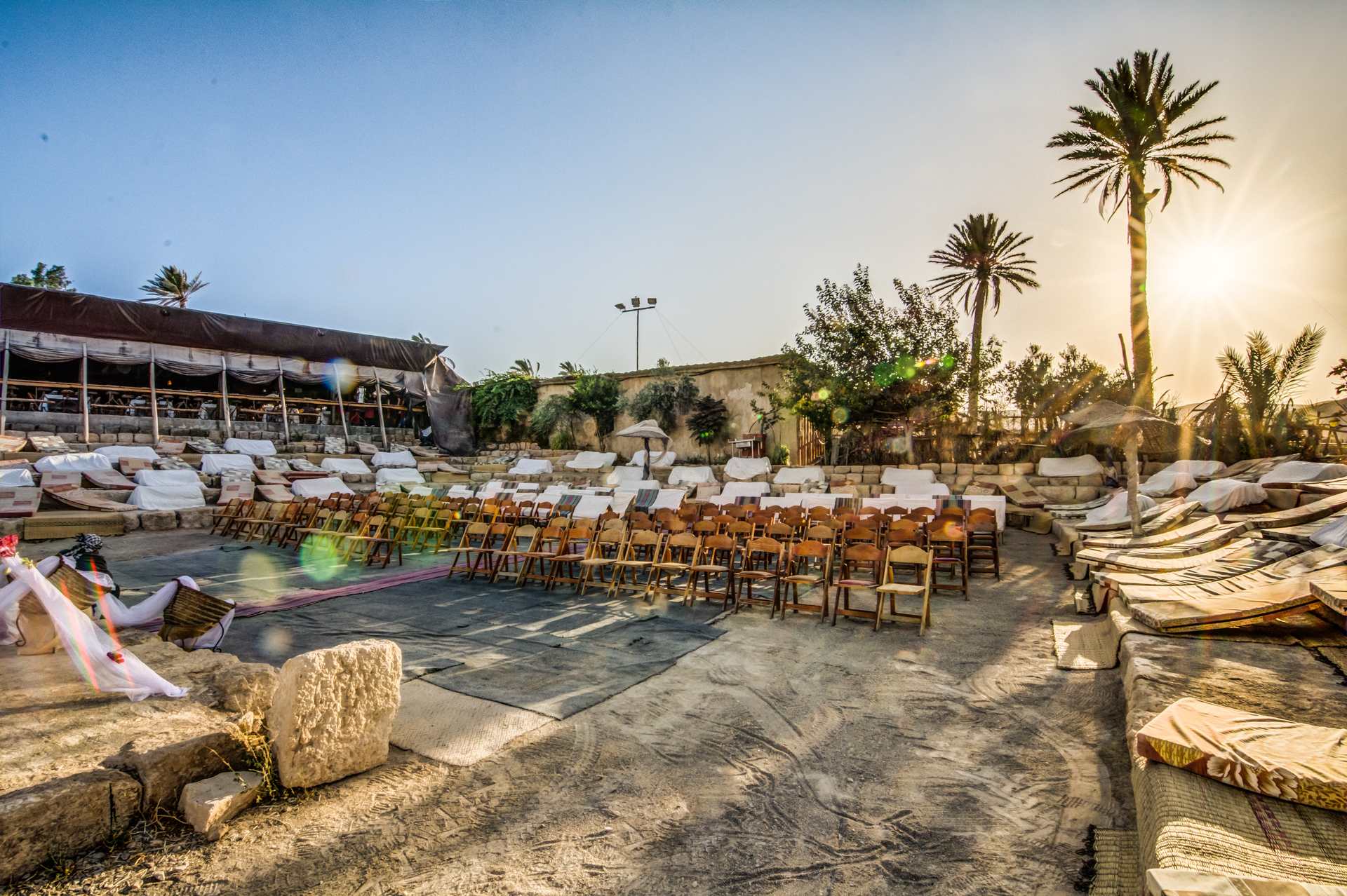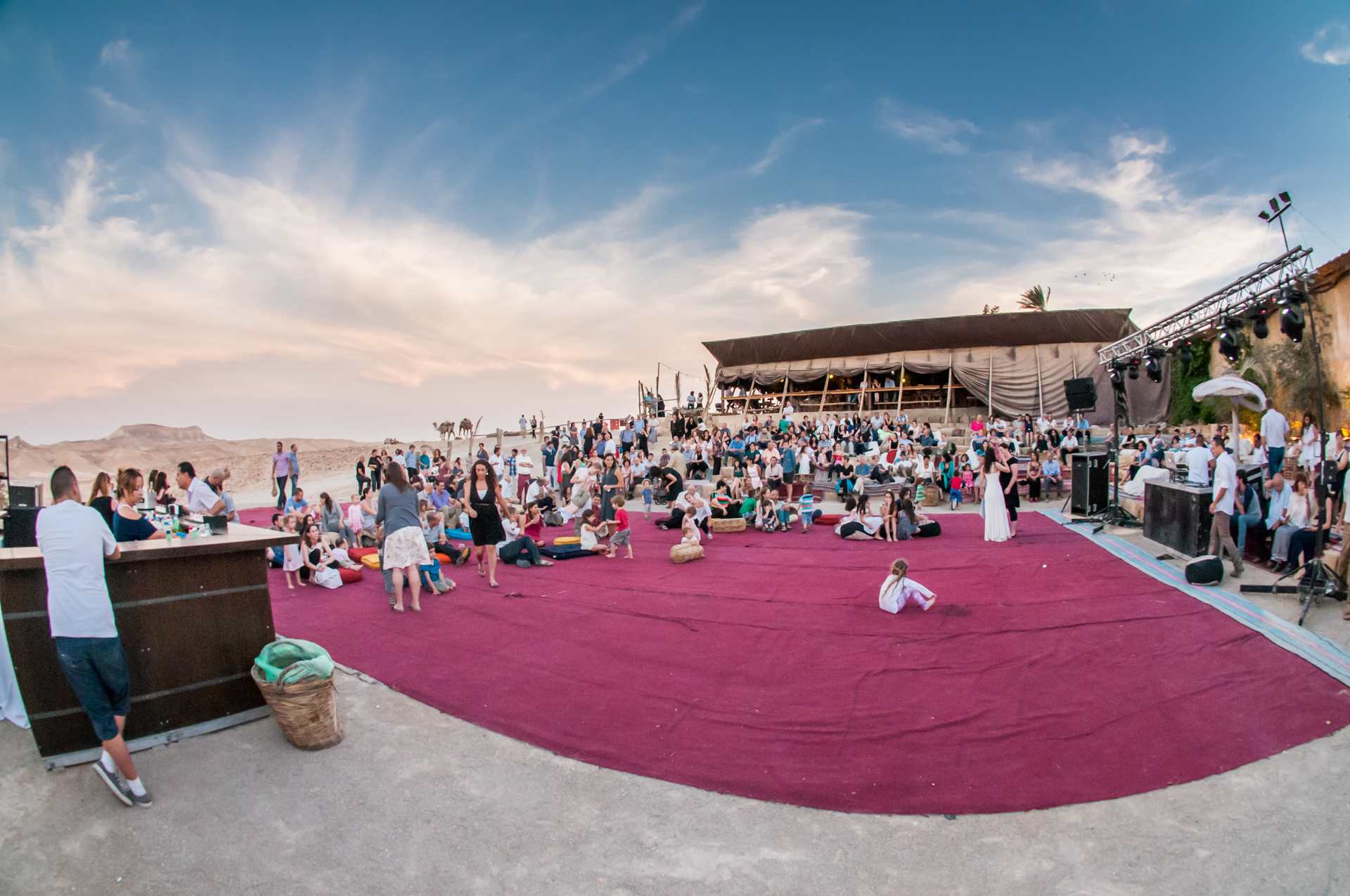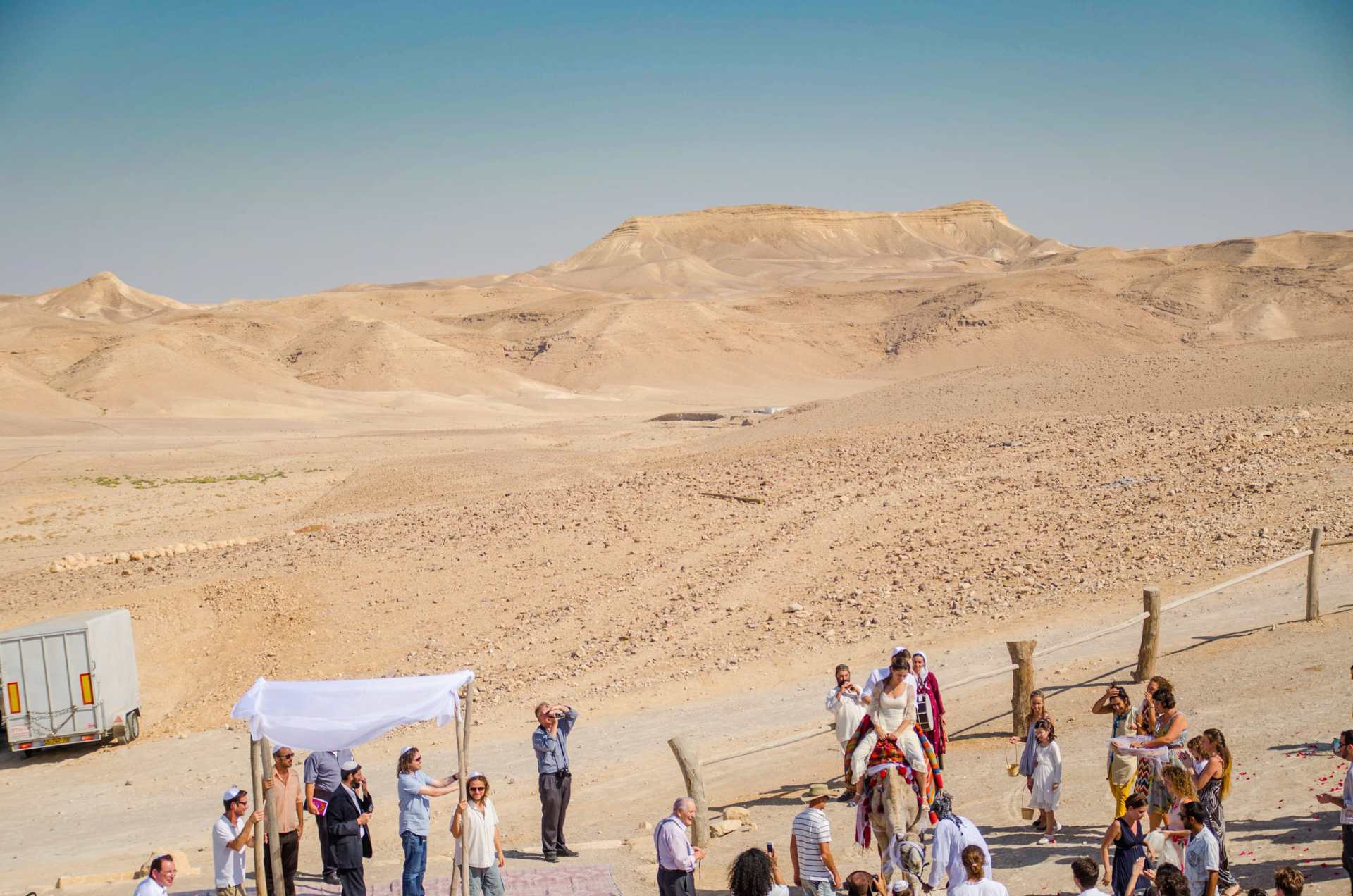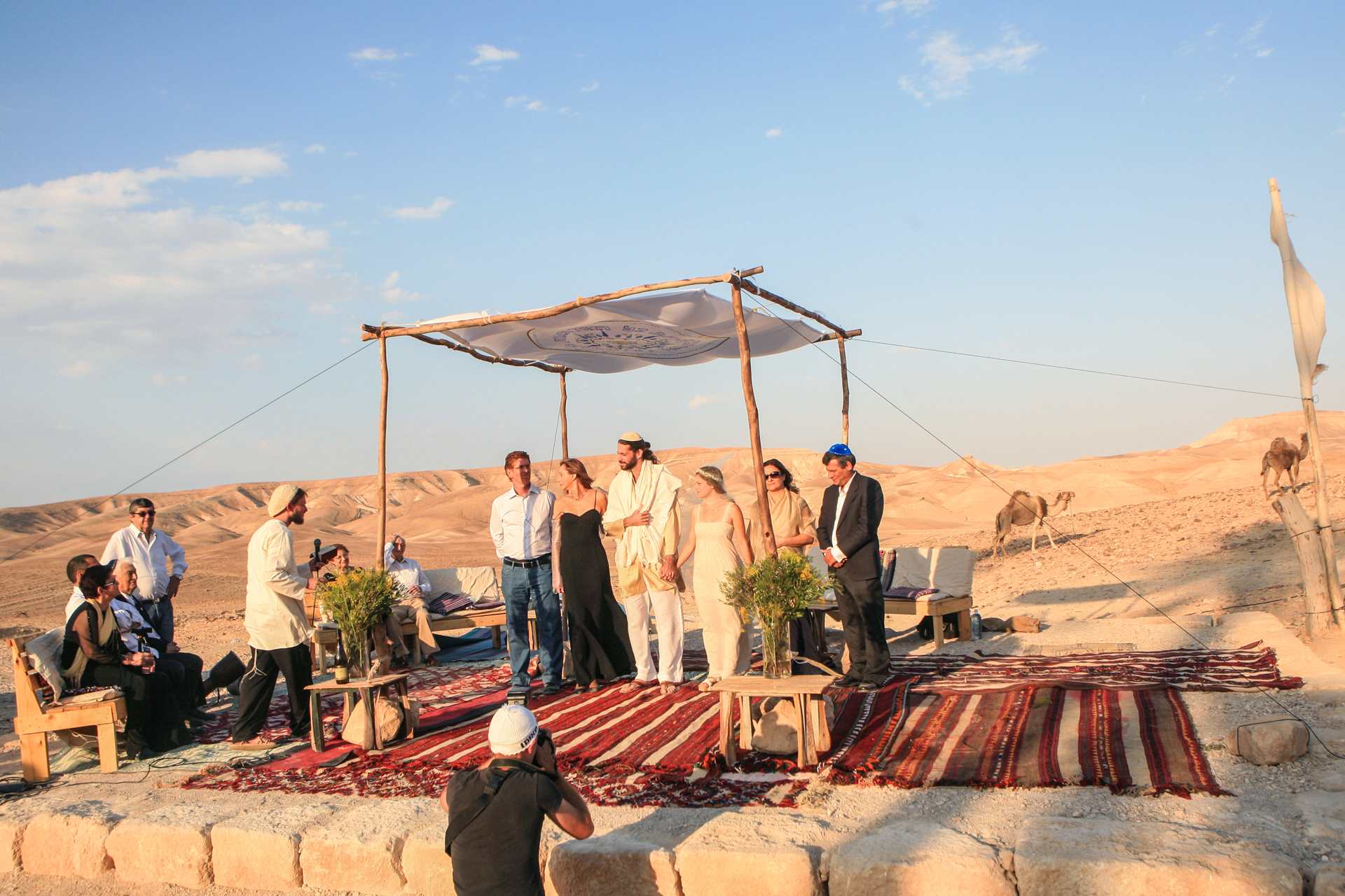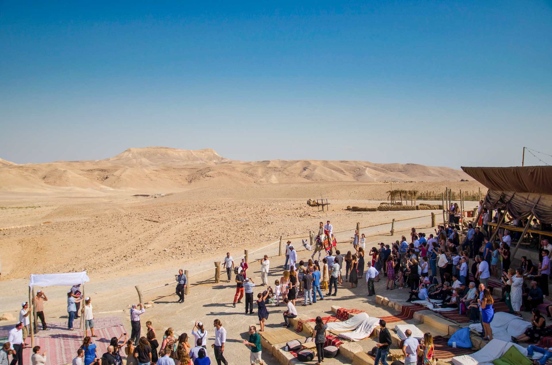 את החתונה תתחילו בקבלת פנים בסגנון "שוק בדואי" ססגוני, רכובים על גמלים. משם תמשיכו לחופה באמפיתאטרון המשקיף אל המדבר, ואחרי שתוכרזו כזוג נשוי, תתחיל חגיגת הריקודים אל מול מרחבי הנוף המדברי. הארוחה העשירה תוגש באולם אבן יפיפה ואחריה תשובו אל רחבת הריקודים. כשתתעייפו, תוכלו לנוח בפינות הזולה הפזורות סביב ולפרוש אל קומזיץ אל תוך הלילה. אפשר להיזרק באוהל אחרי השמחה הגדולה רוויות האלכוהול, ולמבוגרים שבחבורה יש אפשרות ללון בחדרים. למחרת, תתעוררו לבוקר מדברי ותקנחו בארוחת בוקר מפנקת עם המשפחה והחברים.