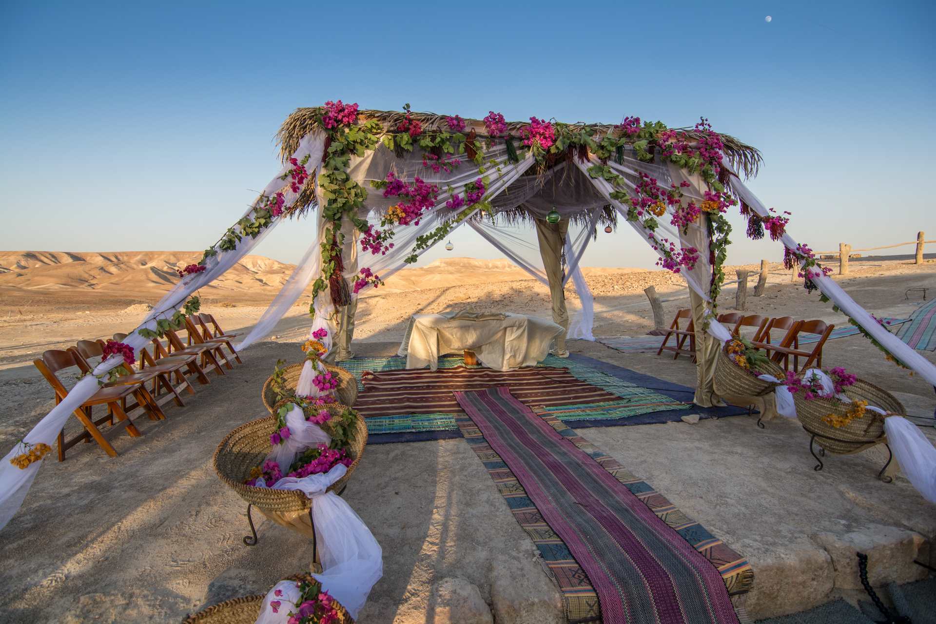 את החתונה תתחילו בקבלת פנים בסגנון "שוק בדואי" ססגוני, רכובים על גמלים. משם תמשיכו לחופה באמפיתאטרון המשקיף אל המדבר, ואחרי שתוכרזו כזוג נשוי, תתחיל חגיגת הריקודים אל מול מרחבי הנוף המדברי. הארוחה העשירה תוגש באולם אבן יפיפה ואחריה תשובו אל רחבת הריקודים. כשתתעייפו, תוכלו לנוח בפינות הזולה הפזורות סביב ולפרוש אל קומזיץ אל תוך הלילה. אפשר להיזרק באוהל אחרי השמחה הגדולה רוויות האלכוהול, ולמבוגרים שבחבורה יש אפשרות ללון בחדרים. למחרת, תתעוררו לבוקר מדברי ותקנחו בארוחת בוקר מפנקת עם המשפחה והחברים.