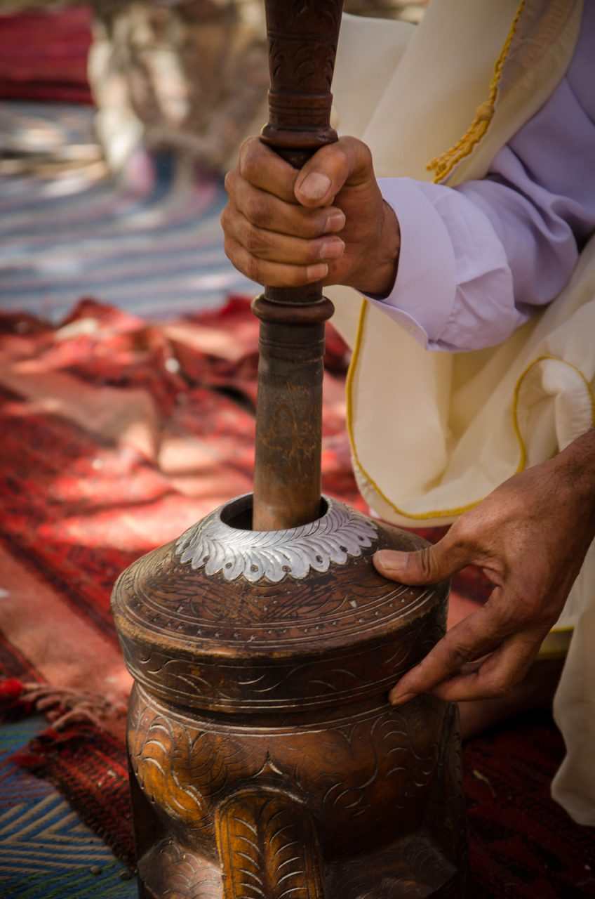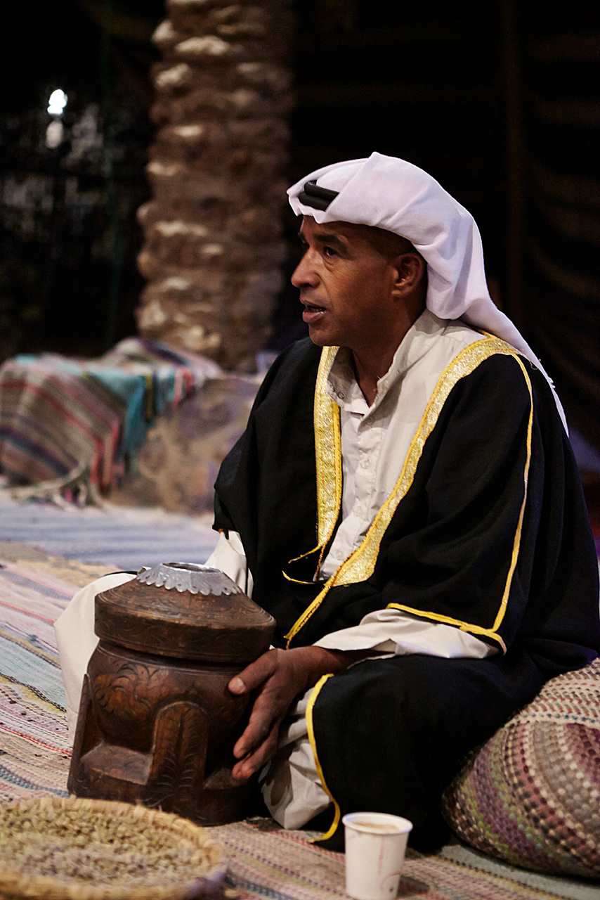 המארח מקבל את פני האורחים ומזמין אותם להתרווח באוהל הרחב סביב המדורה. תחילה הוא מכבד את אורחיו בתה מתובל בצמחי מדבר, ומיד ניגש לטקס המסורתי של הכנת הקפה: הוא קולה לעיני האורחים את פולי הקפה, טוחן אותם במכתש ובעלי, תוך השמעת קול תיפוף קצבי מסורתי, ולבסוף מבשל את הקפה ומגיש לאורחים. לאחר טקס הקפה מכין המארח פיתות על הסאג', אותן הוא מגיש לאורחים לטעימה. הפעילות מלווה בדברי הסבר ובסיפורים מהווי חיי הבדואים.