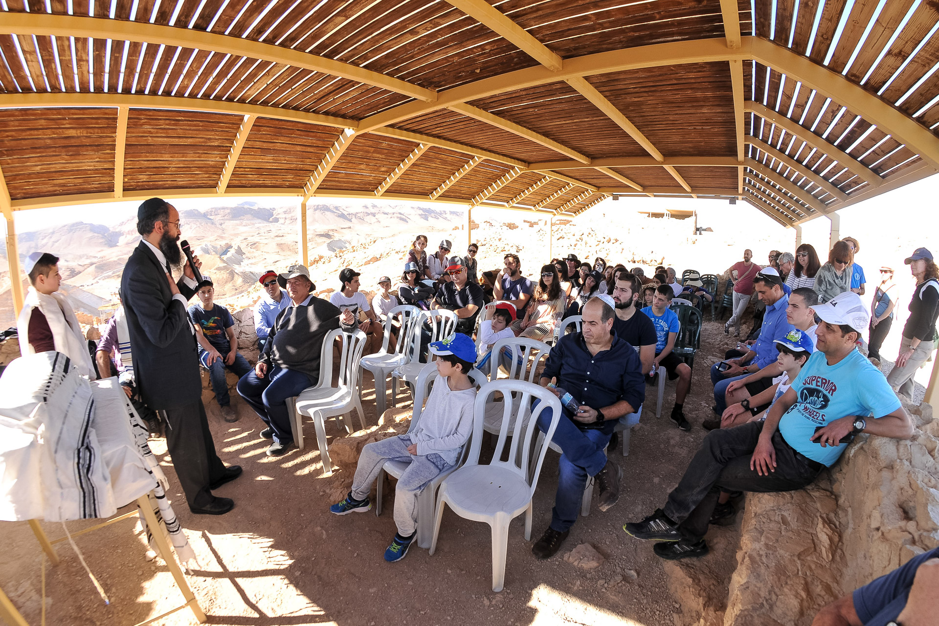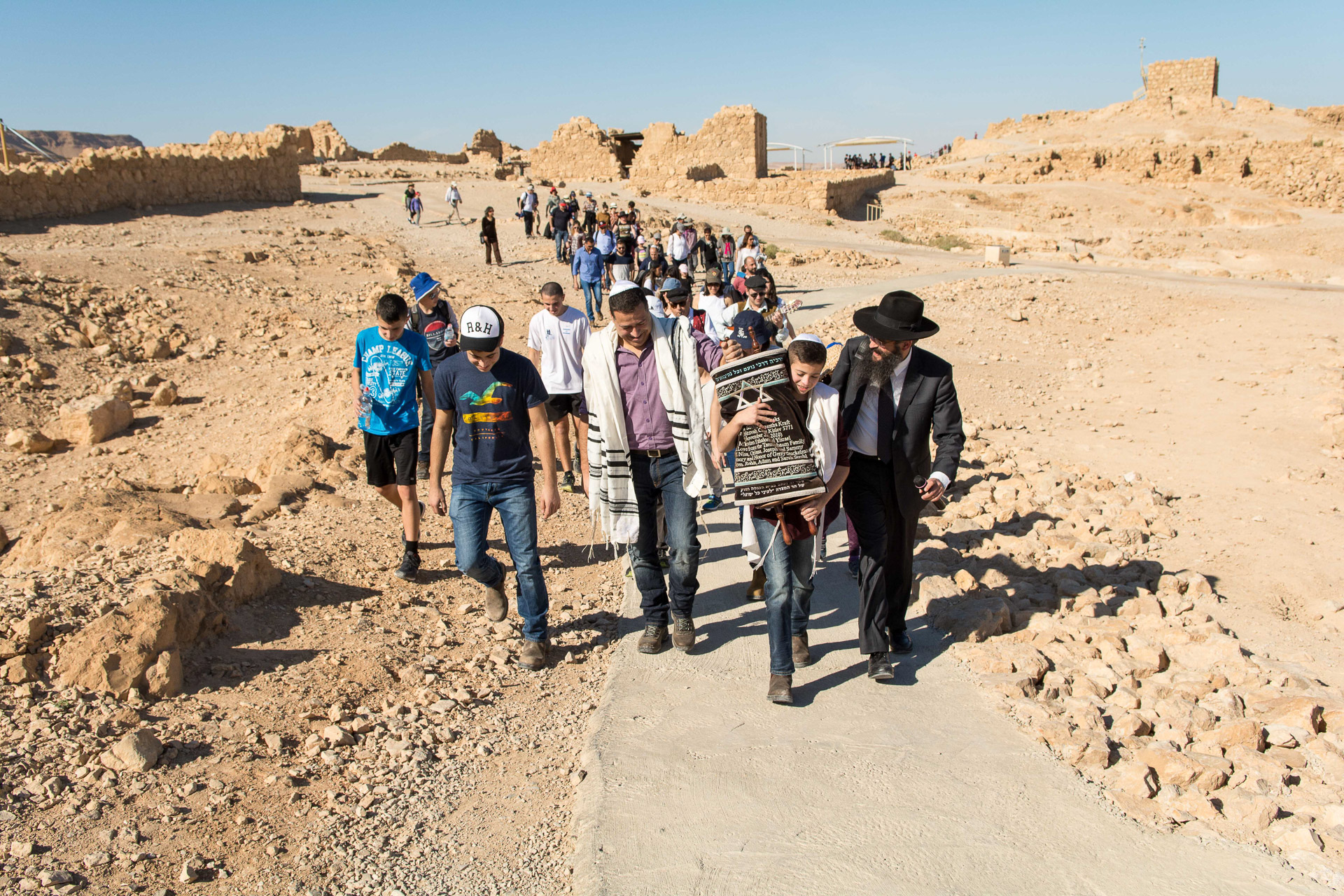 At Kfar Hanokdim, located a 15 minute drive from Masada-West, you can hold an unforgettable desert Bar or Bat Mitzvah. Celebrate the ceremony at the world’s ancient synagogue, at the top of Masada, overlooking the desert wilderness, imbued with historical significance. The ceremony, conducted in a traditional Jewish manner, which is well suited to most secular families, is led by Rabbi Shimon in a humorous and lighthearted way, with songs and games. You are invited to stay with us at the Kfar on the evening before the Bar mitzvah ceremony and to ascend Masada at dawn or visit us after the ceremony. You can choose from our range of accommodation options, enjoy a festive meal, and also partake in our diverse range of interesting activities and workshops. In particular, we recommend the “Trek in the Footsteps of our Forefathers”: an ODT activity specially adapted for the desert, formulated for the celebration of the Bar/Bat Mitzvah by connecting the young boy or girl to the illustrious Jewish dynasty of the people of Israel and to our desert roots.
