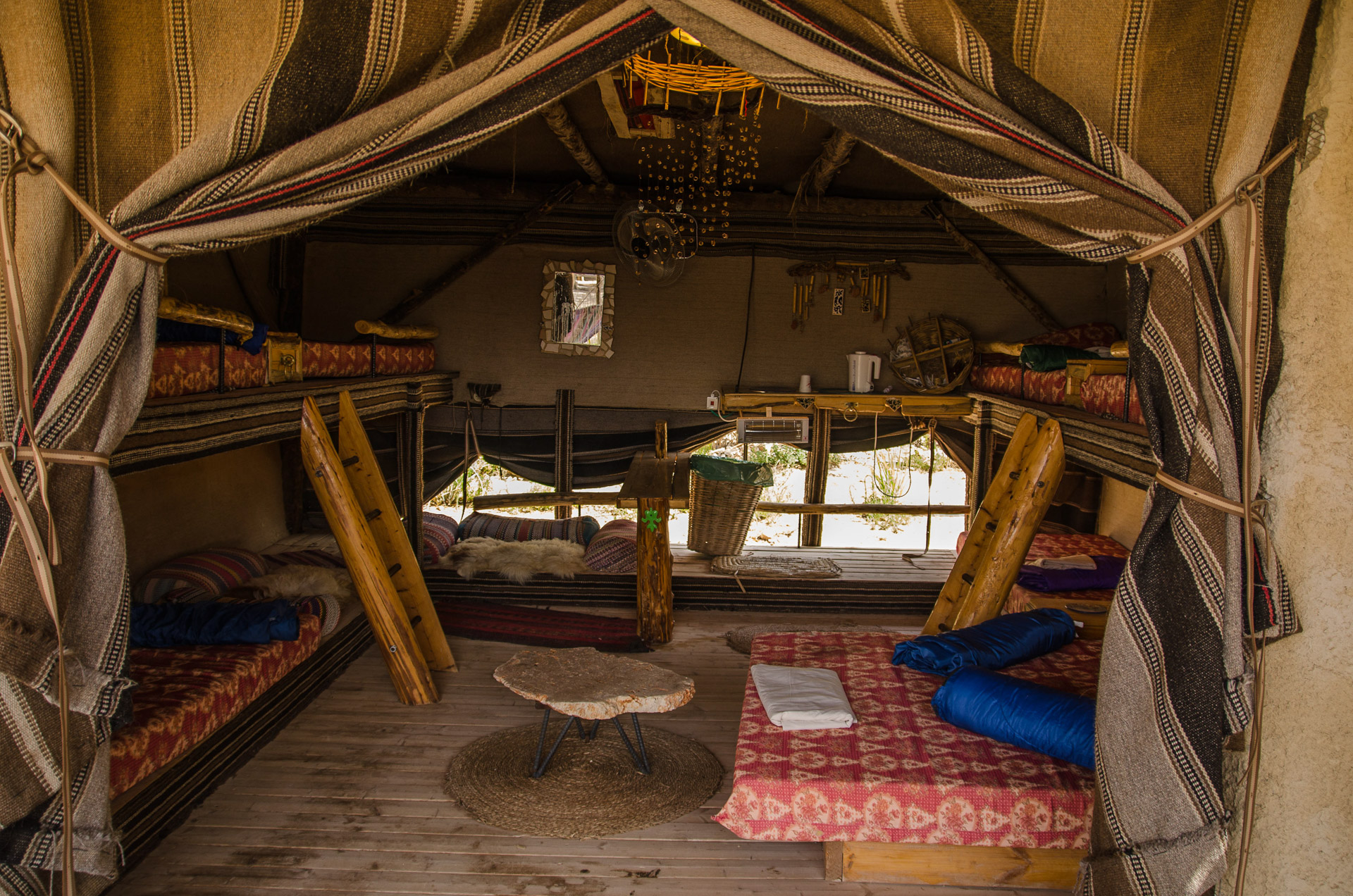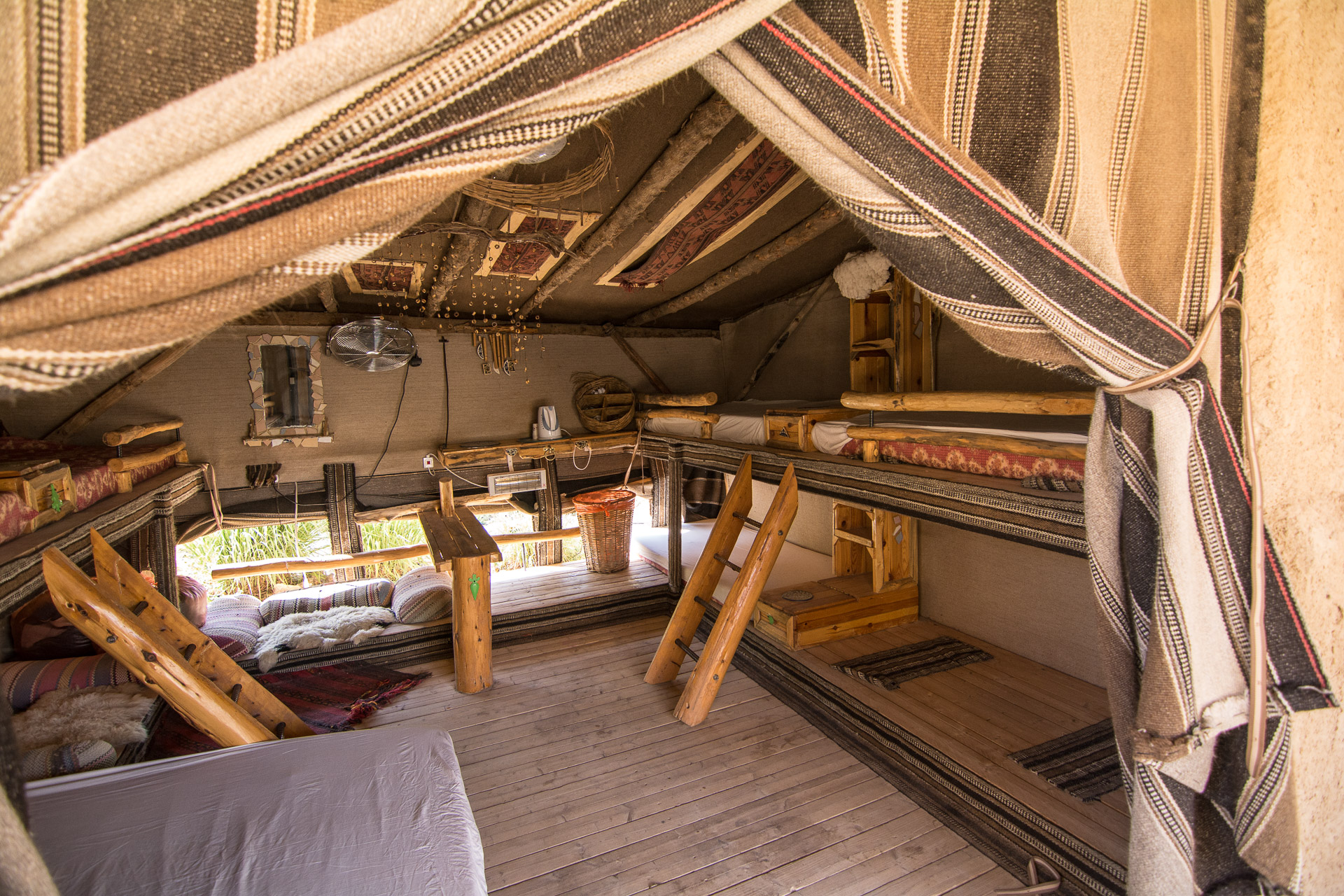 The sukkahs are made of material woven from goat hair, and the floor is paved with wood. There are sleeping futons in the sukkah, coffee-making facilities and an elevated veranda, from which you can savor the desert views over wilderness that stretches as far as the eye can see.